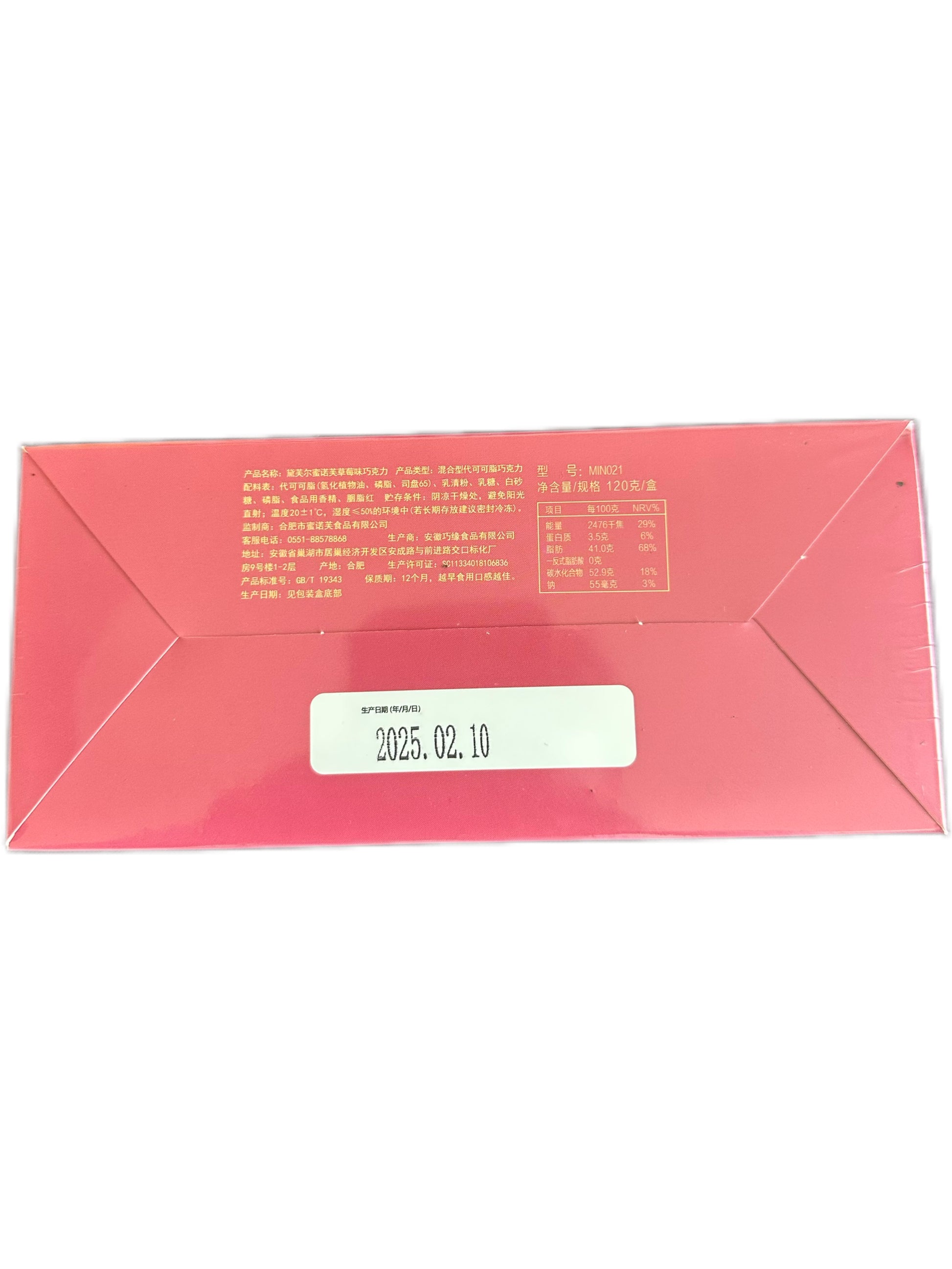 Ainesosat: Kaakaovoin korvike (hydrattu kasviöljy, lesitiini, Span 65), herajauhe, laktoosi, sokeri, lesitiini, elintarvikearomi, karmiini