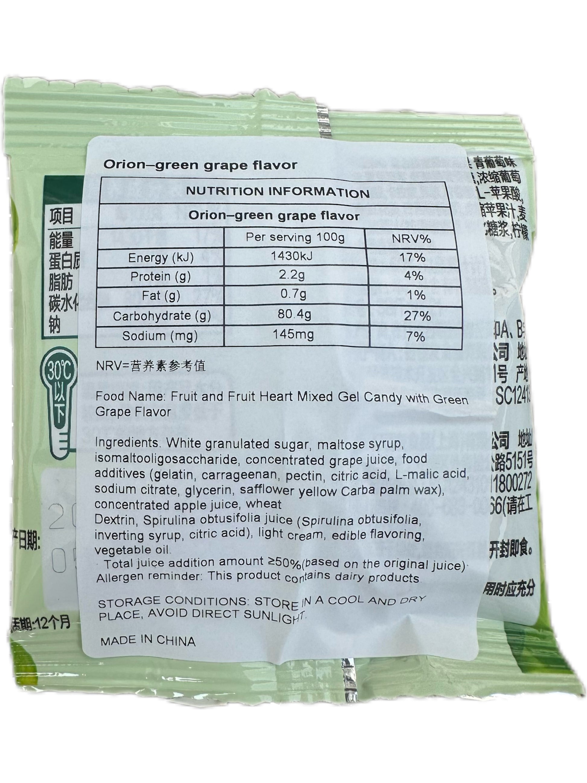 Ainesosat: Valkoinen kidesokeri, maltoosisiirappi, isomaltooligosakkaridi, tiivistetty viinirypälemehu, elintarvikelisäaineet (gelatiini, karrageeni, pektiini, sitruunahappo, L-omenahappo, natriumsitraatti, glyseriini, saflorin keltainen Carba-palmuvaha), tiivistetty omenamehu, vehnädekstriini, Spirulina obtusifolia -mehu (Spirulina obtusifolia, inverttisokeri, sitruunahappo), kevyt kerma, syötävä aromi, kasviöljy.