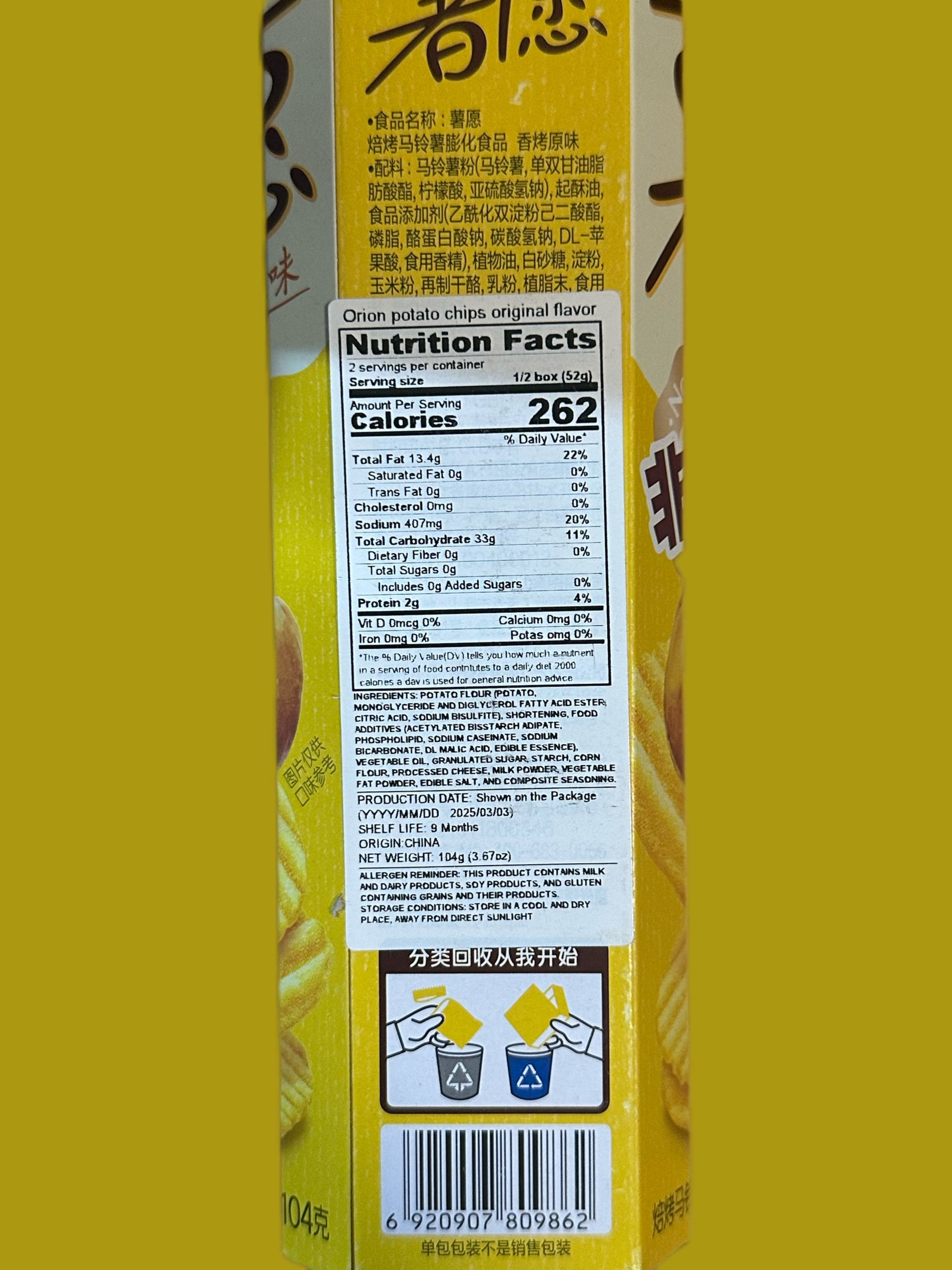 Orion perunalastuja alkuperäisellä maulla, eli tutulla suolalla. Varmasti monelle tuttuja perunalastuja.
