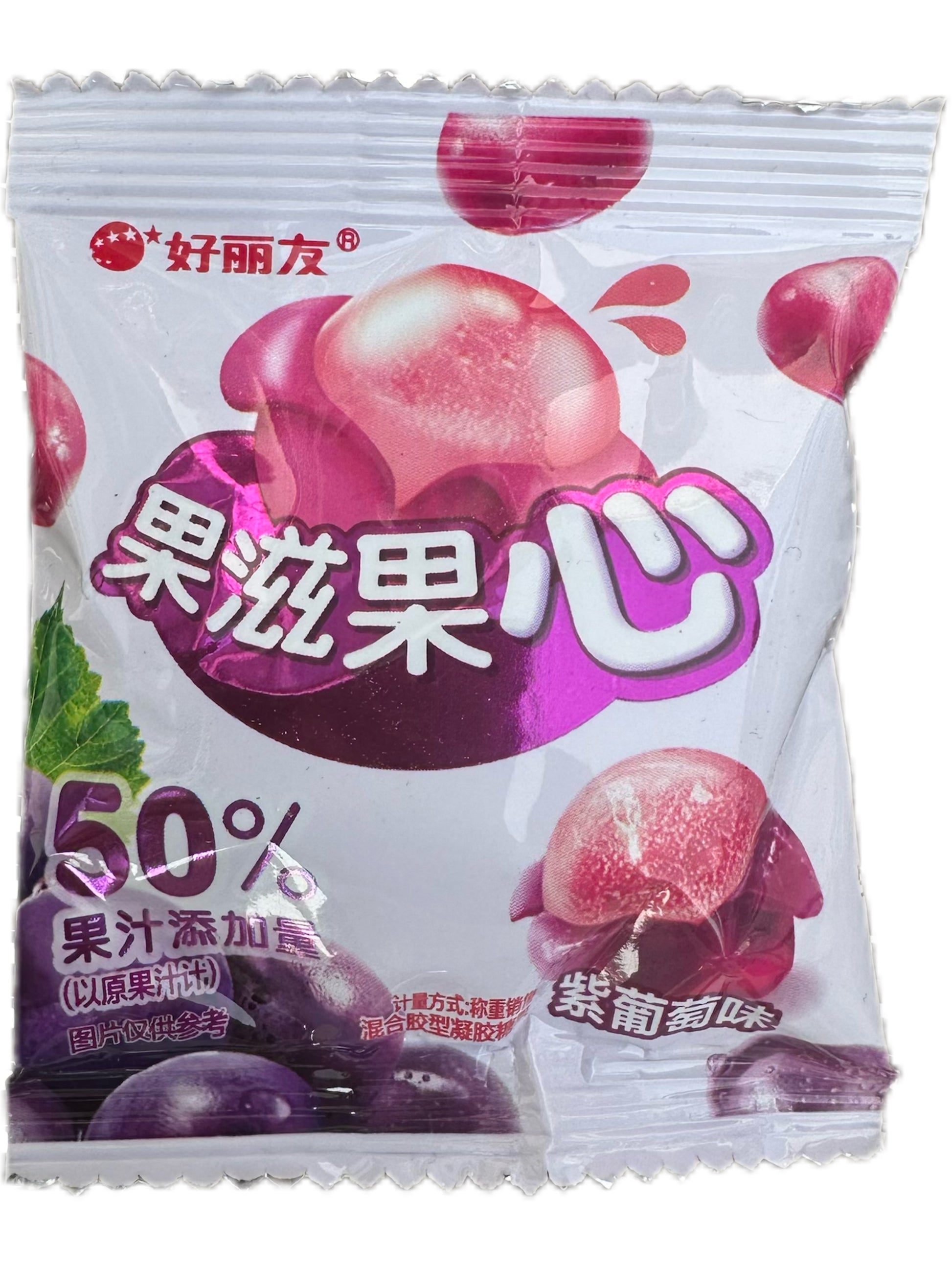 Ainesosat: Valkoinen kidesokeri, maltoosisiirappi, isomaltooligosakkaridi, elintarvikelisäaineet (gelatiini, karrageeni, pektiini, sitruunahappo, L-omenahappo, natriumsitraatti, karbamaha), tiivistetty viinirypälemehu, tiivistetty omenamehu, maltodekstriini, tiivistetty violetti porkkanamehu, kevytkerma, syötävä aromi, kasviöljy. Lisätyn hedelmämehun kokonaismäärä on >50% (laskettu alkuperäisen hedelmämehun perusteella).