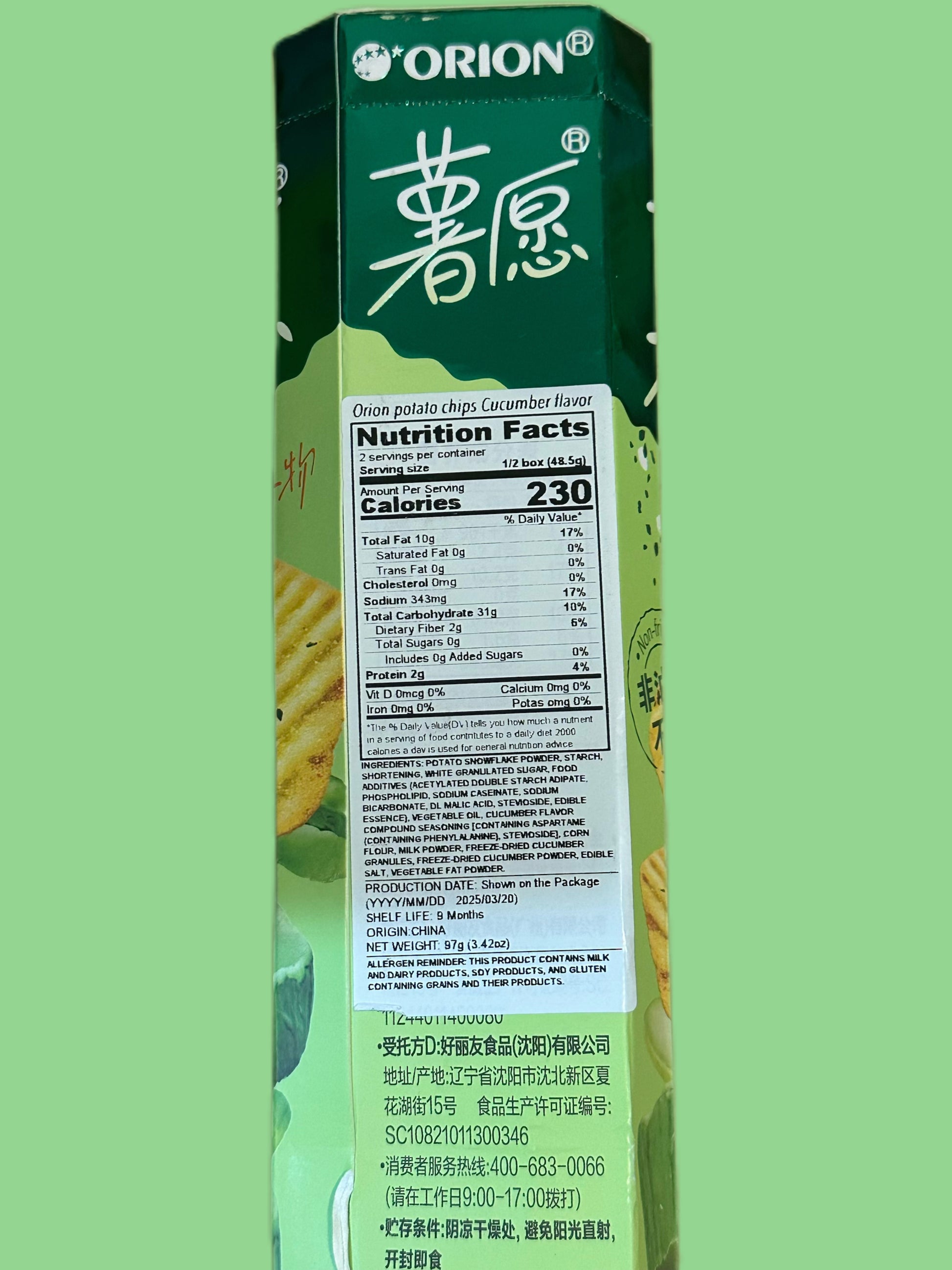 Perunalumijauhe, tärkkelys, kasvirasva, valkoinen sokeri, ruokasuola, maissitärkkelys (asetyloitu kaksoistärkkelysadiopaatti, fosfolipidi), natriumkaseinaatti, ruokasooda, omenahappo, stevisoidi, syötävä esanssi, kasviöljy, kurkkuaromi, mausteseos (sisältää aspartaamia (sisältää fenyylialaniinia), stevisoidi), maissijauho, maitojauhe, pakastekuivattu kurkkujauhe, vilja (gluteenia), suola, kasvirasvajauhe.